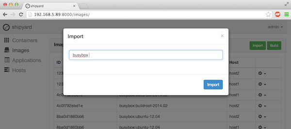 With shipyard managing the docker hosts, we can do things like pull the busybox image from the docker registry. By clicking on images->import and entering the tag of the docker image and clicking import again, the busybox image will be downloaded to both hosts.